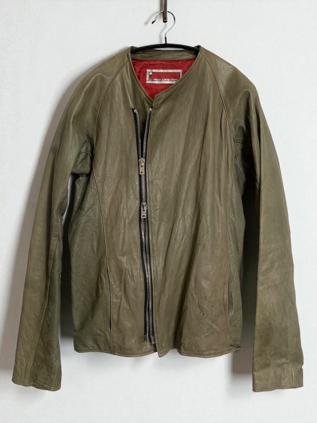 ●商品説明● 参考価格: ¥190,000- 今はなきRipvanwinkleの最高級ライン r LA PROVOCAZIONE ETERNAによる 無駄を削いだ至高の1着は 本来ライダースジャケットにある 野暮ったさを排除した退廃的/モード色の 強い個体で、深い緑とうねりのある 独特なレザーの表情が特徴的。 . . レザーには厳選された柔らかい牛革のみを 使用することで 重厚な見た目を保ちながらも、 滑らかでストレスフリーな着心地を実現。 ダブルジップは位置を変えることで インナー遊び/気分によるシルエットの 変化/腰・腹回りの*快適性を担保。 ※座る時に上がってこないetc... また、ただの記号としてではなく機能性 として組み込まれたラグラン仕様は、 腕回りの機能性を確保してくれます。 . . 襟を排したミニマルな首元、 身体に沿うラグランの曲線、 斜めに走るダブルジップ 深みのあるオリーブトーンと Lampo製ジップの鈍い光沢 余計な装飾を削ぎ落としつつも 細部に拘った構成は、他にはない 独特な雰囲気を放ちます。 . . ▼機能性 耐久性は保ちつつも滑らかさを 底上げされたポリシルクの裏地 によってインナーとの摩擦を軽減 快適な着心地に。 重厚な見た目に反して機能性も兼ね備えた ライダースジャケットをお探しの方は この機会に是非。 関連イメージワード デザイナーズ イサムノグチ バックラッシュ ストラム リックオウエンス rick owens The viridi anne ザヴィジリアン アルチザン strum backlash boris bidjan saberi ●[about] (cm) Shoulder(肩幅): ラグラン仕様のため定値提示不可 *おおよそ46〜48の人が適正 Width(身幅):48 Length(着丈):70 *サイズ表記 3 着用感 M~L相当 ●素材表記- 本体:Cow leather/牛革(柔) 裏地:Polyester×Silk -CAUTION- 購入の際は必ず、事前に『お知らせ-ご購入前に-』を一読し、ご確認ください。↓↓↓ https://ifusedclo.theshop.jp/items/78247509 [ONLINE STORE] shop name : intrfc.weB この度、instagramのカタログアカウントを開設しました。今後はこちらのアカウントからHP掲載前のアイテムについて先行販売のご案内やフォロワー様限定のクーポン配布など、お得な情報を配信していきますので、この機会に是非ご利用ください。 instgrmカタログ垢: (@intrfc_online.jp) https://www.instagram.com/intrfc_online.jp .,