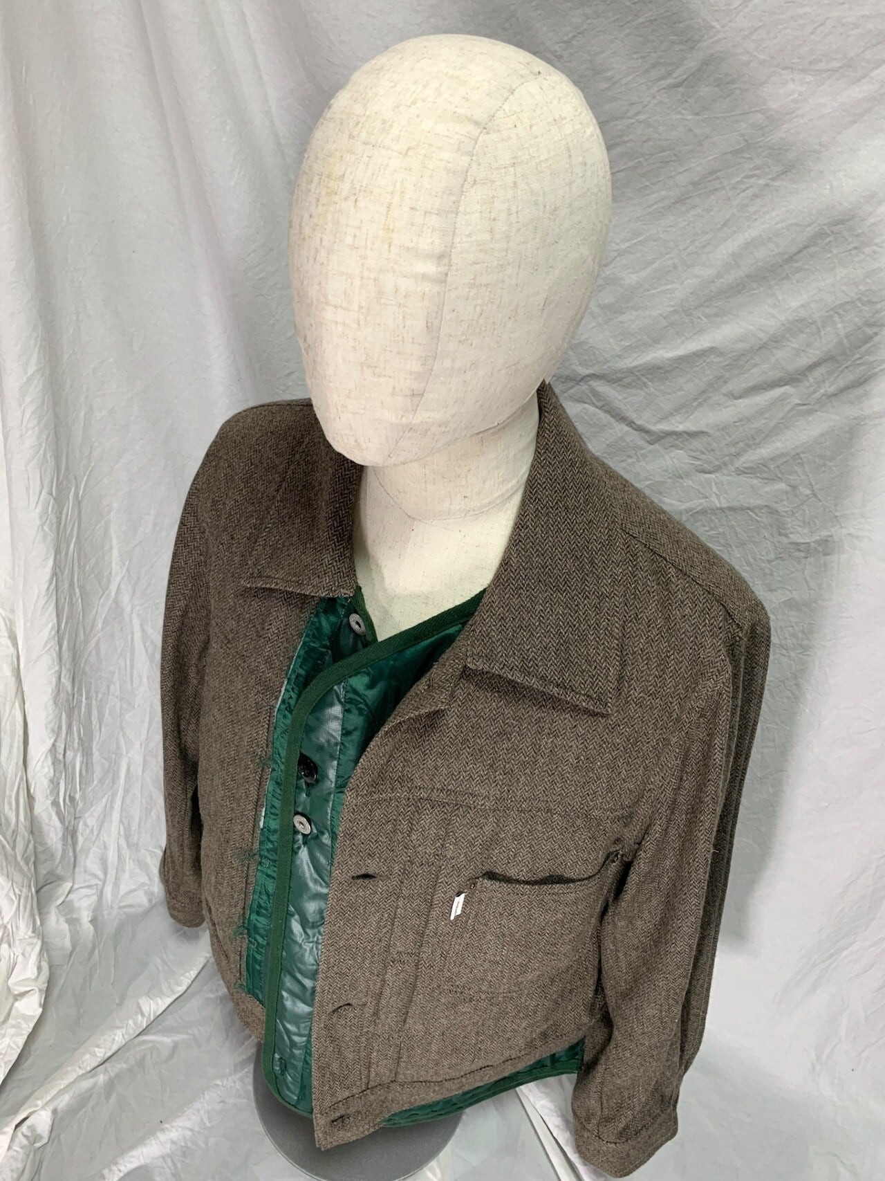 ●商品説明● デニムジャケットの 1stモデルを再解釈 再構築した"Elephant tribal fabrics" "Quilted Layered Wool Jacket"。 ヴィンテージデニムの無骨な造形を ベースに、 表地を上質なウールで 仕立てることで 野暮ったさを感じさせない端正な 佇まいに昇華しています。 内側には鮮やかなグリーンの キルティングライナーを重ね、 差し色としての存在感と 防寒性を両立。 開閉時にさりげなく覗く差し色が、 スタイルに奥行きを与えます。 また、前立てには2種類のボタンを採用。 留め方によって印象が変わりその日の気分に よって異なるスタイリングを楽しめます。 背面にはアジャスターベルトを備え、 シルエットのコントロールも可能。 本来のデニムジャケットにはない 雰囲気を醸し出す異素材で再構築 されたアイテムをお探しの方は、 この機会に是非。 ・コンディション:良好(ダメージ・汚れなし) ・素材:Wool × Polyester(キルティング) ・カラー:Brown Herringbone × Green Liner ・仕様:ダブルボタン/キルティング ・生産国:Japan [about] (cm) Shoulder(肩幅):49 Width(身幅):61 Length(着丈):64 *サイズ表記 M 着用感 L~XL相当 ●素材表記- 本体:WOOL/POLYESTER 裏地A:POLYESTER テープ:COTTON 商品について気になる点や 不安な点はいつでも気軽に お声掛けください 。 -CAUTION- 購入の際は必ず、事前に『お知らせ-ご購入前に-』を一読し、ご確認ください。↓↓↓ https://ifusedclo.theshop.jp/items/78247509 [ONLINE STORE] shop name : intrfc.weB この度、instagramのカタログアカウントを開設しました。今後はこちらのアカウントからHP掲載前のアイテムについて先行販売のご案内やフォロワー様限定のクーポン配布など、お得な情報を配信していきますので、この機会に是非ご利用ください。 instgrmカタログ垢: (@intrfc_online.jp) https://www.instagram.com/intrfc_online.jp .,